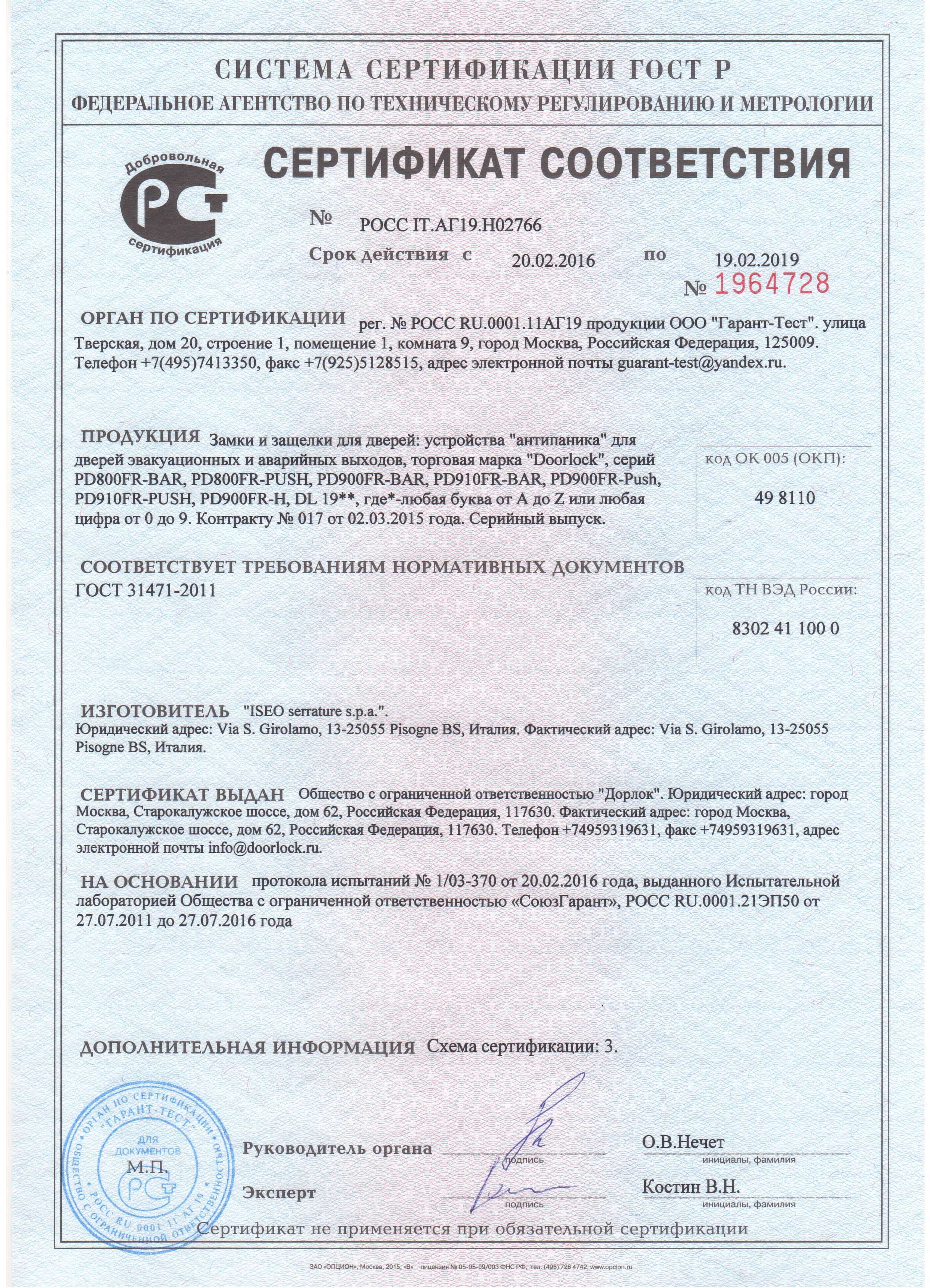 3. Стандарт качества. Все наши механизмы и комплектующие систем «антипаника» сертифицированы по ГОСТ 31471-2011. Сертификатом подтверждено, что их разрешено использовать как на эвакуационных, так и на аварийных дверях.